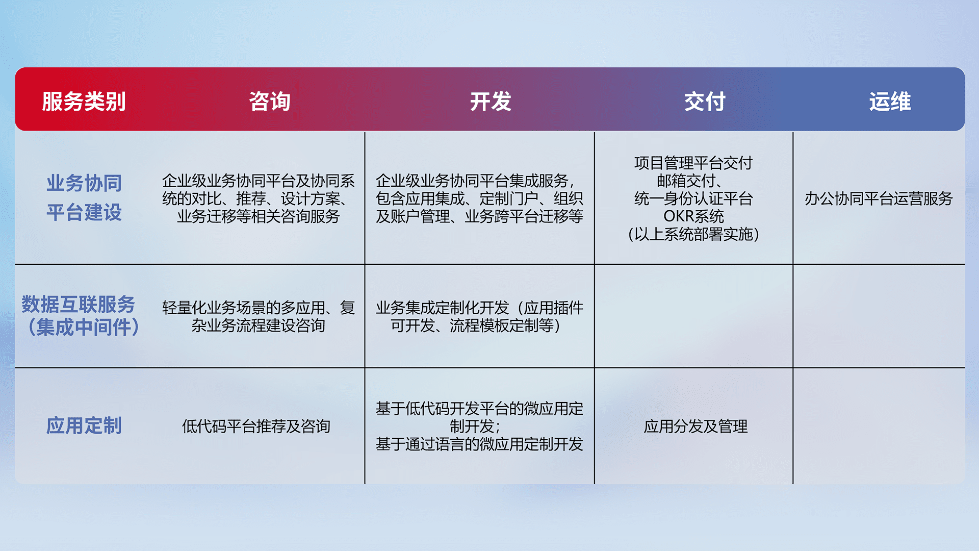 针对钉钉、、、、企微、、IDaas等平台级产品提供产品的规划、、方案、、、交付、、、、定制化开发等服务,,,,实现如统一协同办公、、、、智能客户服务、、混合会议管理、、、、智能数据查询、、、等业务场景,,,,实现数字化转型。。